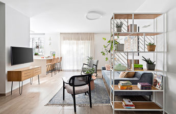 מי גר בבית? זוג, הילדים אינם גרים כבר בבית. תנאי השטח: דירה בת 25 שנים, גודל הדירה 120 מ"ר וחצר קטנה. על מה חלמו הדיירים? דגש על פרקטיות, ריבוי מקומות אחסון ויצירת חדר עבודה\קבלה שיהיה כמה שיותר מופרד מהדירה. הסגנון העיצובי: קווים נקיים בשילוב צבעוניות בהירה וחמימה. השינויים בחלוקת המרחב: יצירת חדר עבודה בכניסה לבית, הזזת שרותי אורחים, הרחבת איזור שולחן פינת האוכל, תחושת מרחב מוגדל לבית כולו. תכנון מקומות אחסון רבים. צילום: מאור מויאל
